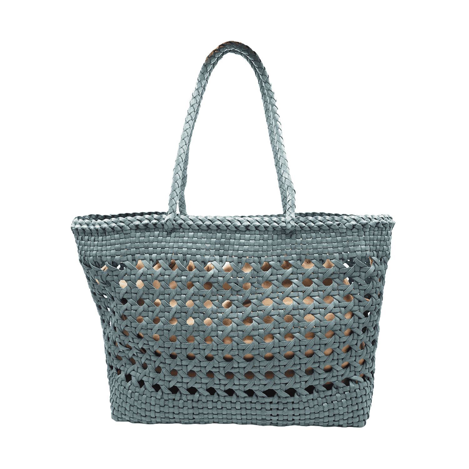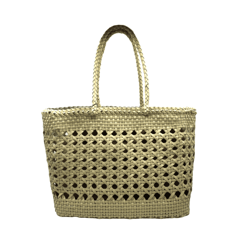 It features two large woven leather handles that allow to wear the bag comfortably on the shoulder, perfect for spring and summer outfits. Handcrafted, 100% Made in Italy.