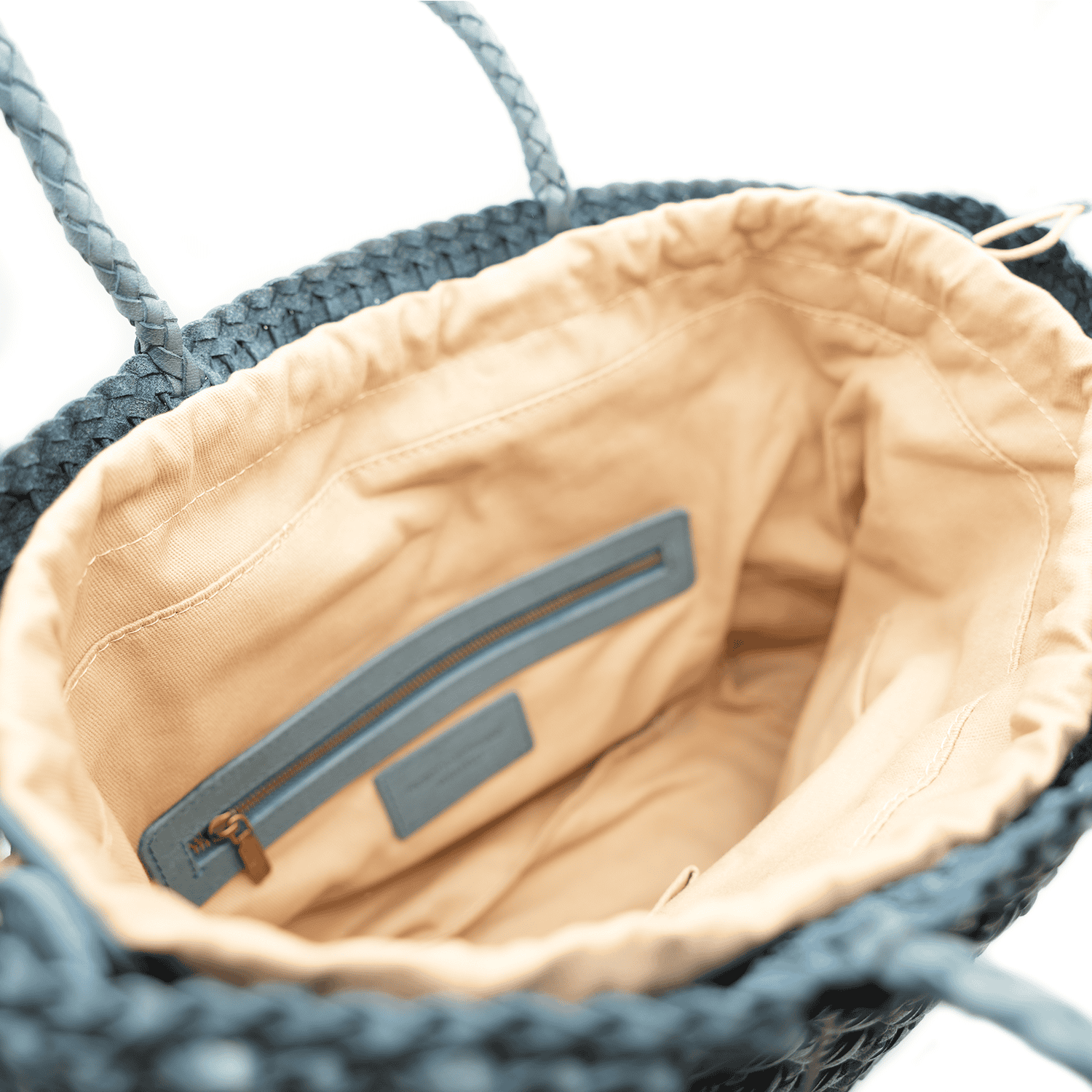The Desideria bag is unlined and equipped with an internal bag in cotton gabardine fabric with leather trim, which can be closed with a drawstring.