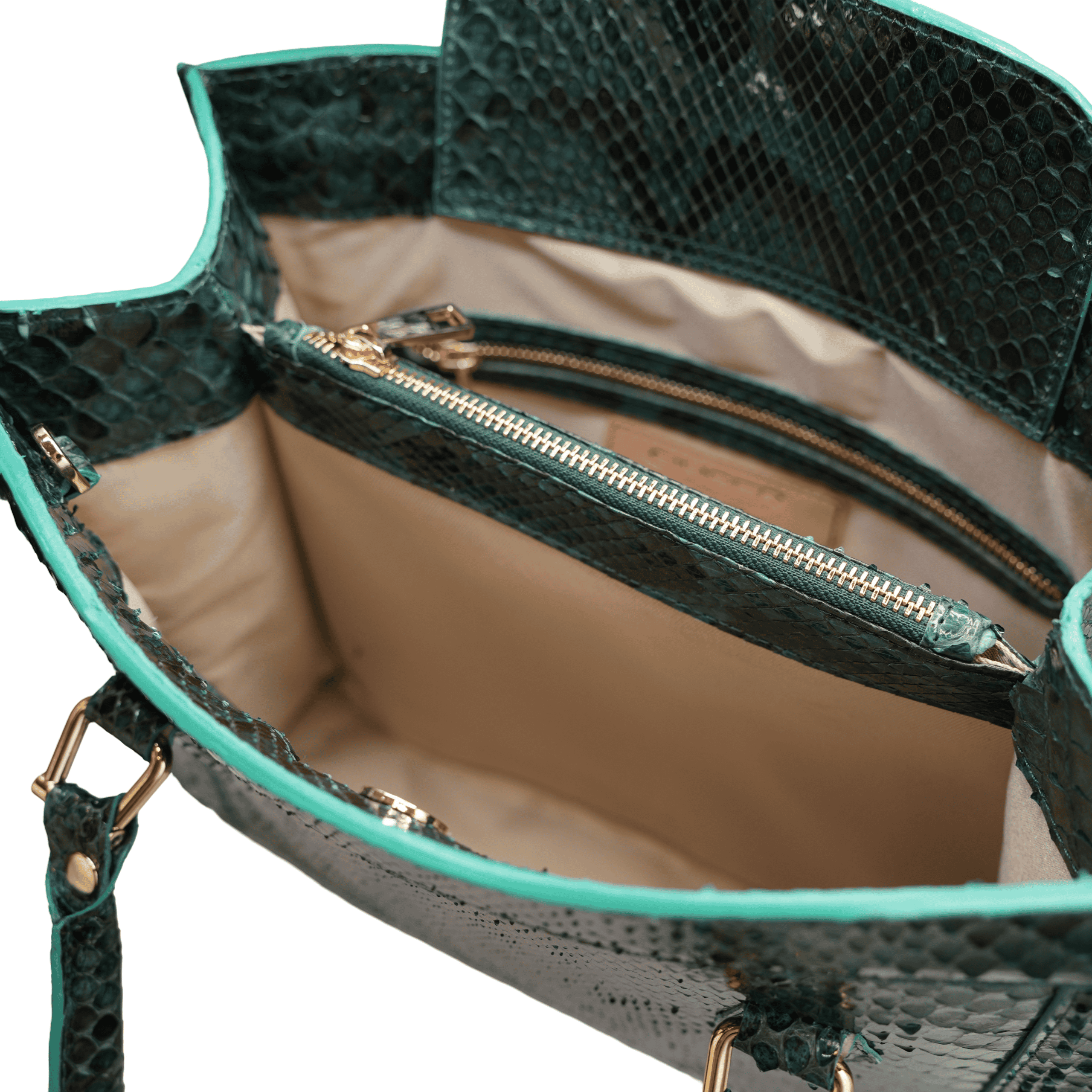 Doppia maniglia rigida in pelle di pitone, due ampi comparti interni, divisi da una tasca tramezza centrale con chiusura a zip e una tasca piatta interna.