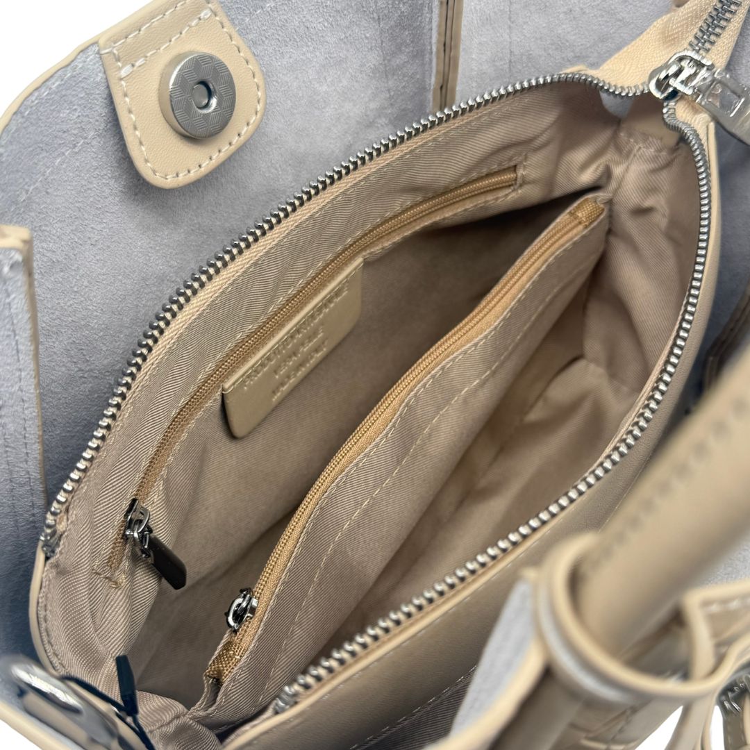 Contemporanea. Raffinata. Funzionale. Un connubio di stile e praticità. Dal design moderno e lineare, la borsa Ellie, è realizzata morbida pelle e rifiniture in pelle intrecciata. L’interno è ampio e spazioso, dotato di una maxi pochette al cui interno si trova una tasca piatta interna e una con cerniera. La fodera è realizzata in tessuto gabardine di cotone. Doppia chiusura con cerniera e calamita. È completata da una tracolla rimovibile e regolabile per una doppia opzione di styling. 100% Made in Italy.