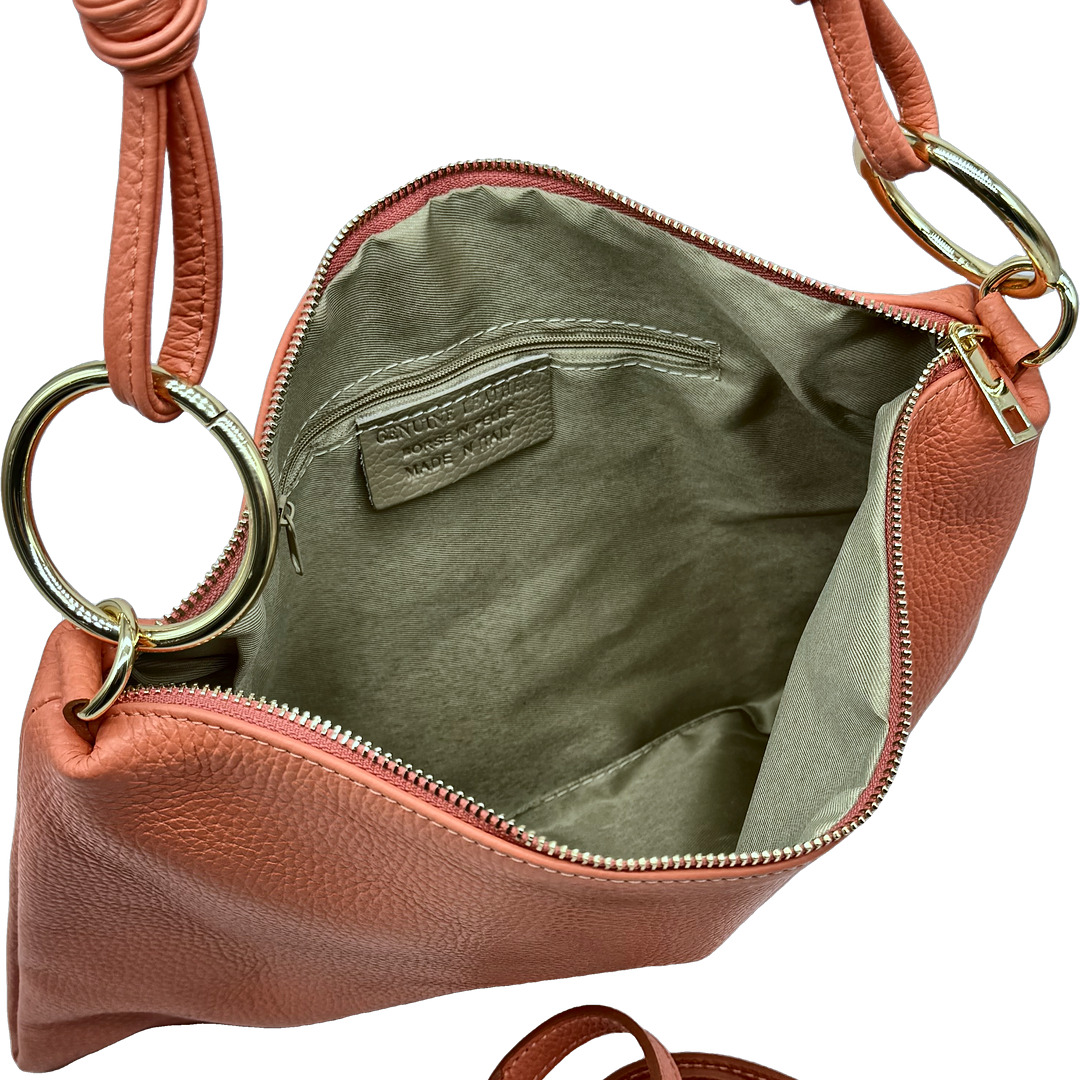 La Lady interpreta il bauletto in chiave easy chic con pelle di vitello e scamosciata, doppia maniglia e maxi pochette interna estraibile. Chiusura con staffa dorata e tracolla regolabile per portarla anche crossbody.