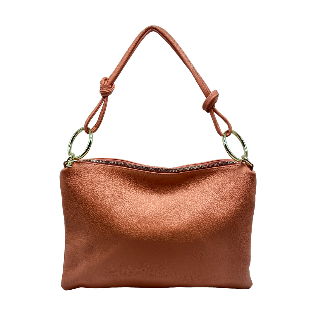 Elegante, raffinata, dallo stile intramontabile. Borsa Frida realizzata in pelle di vitello stampa cocco effetto lucido, un connubio di stile e versatilità. Le linee geometriche del modello vengono rifinite dalla maniglia in bambù e dalla chiusura con girello con bambù placcato oro chiaro.