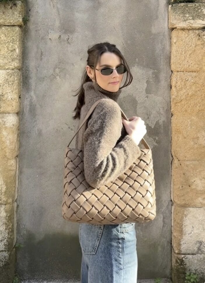 La Lucy unisce pelle intrecciata e design easy chic in una mini bag capiente con doppia maniglia, tracolla regolabile e chiusura a zip. Interni in gabardine di cotone.