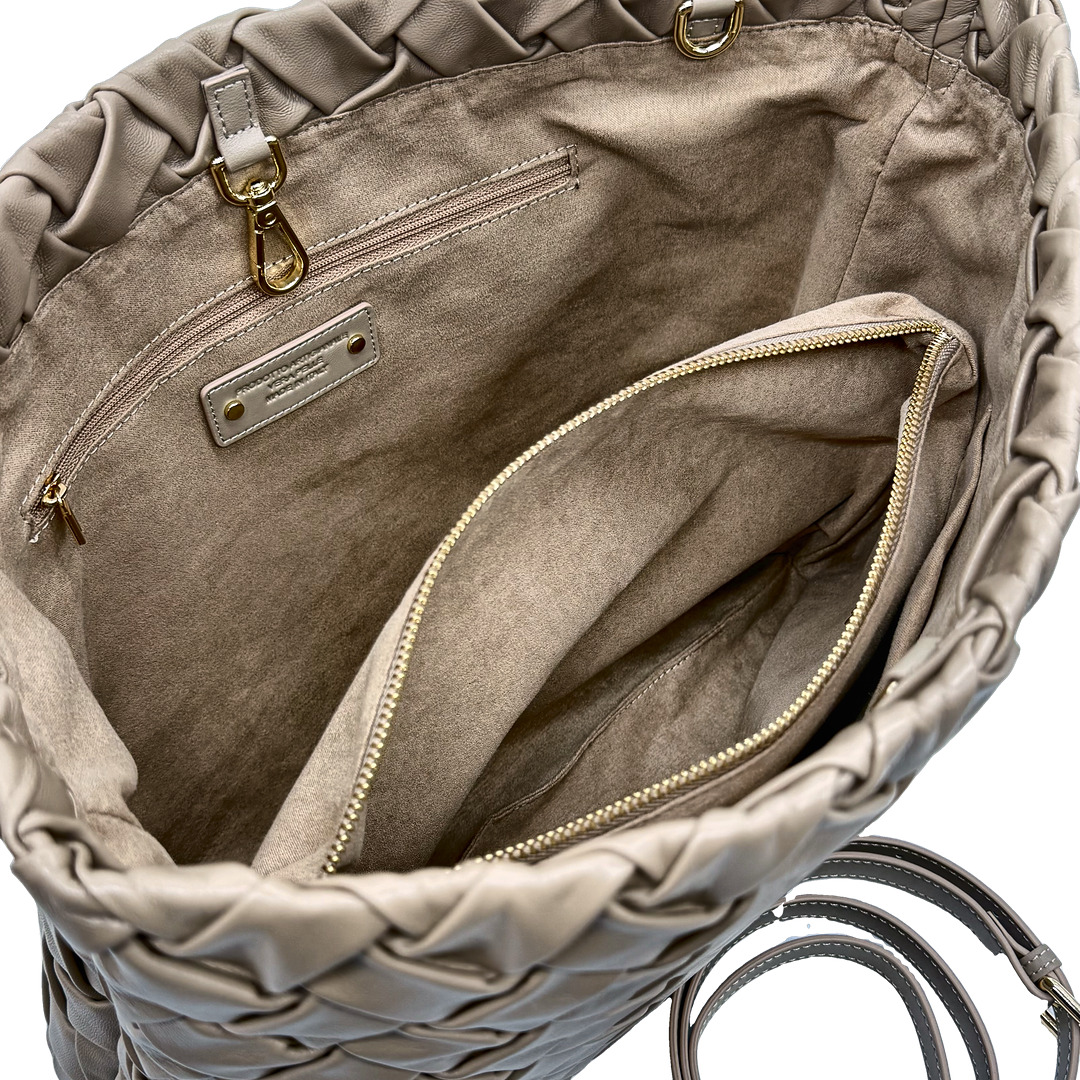 Capiente. Raffinata. Funzionale. Un connubio di stile e praticità. Dal design moderno e lineare, la borsa Mara, è realizzata morbida pelle intrecciata. L’interno è ampio e spazioso, dotato di una maxi pochette al cui interno si trova una tasca piatta interna e una con cerniera. La fodera è realizzata in tessuto. Doppia chiusura con cerniera e calamita. È completata da una tracolla rimovibile e regolabile per una doppia opzione di styling. 100% Made in Italy.