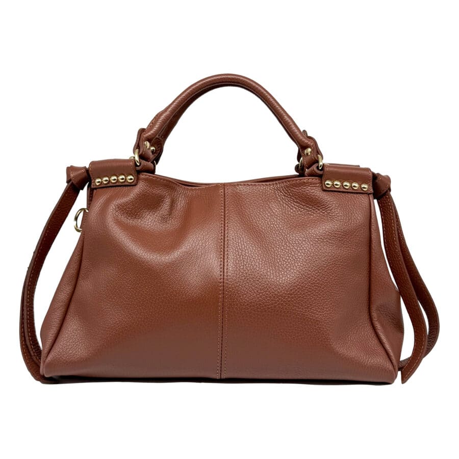 Capiente, pratica, urbana. Silhouette grintosa per la borsa Mary, formato tote bag, dalle medie dimensioni, realizzata in morbida pelle di vitello togo e impreziosita da piccole borchie sferiche dorate. Lavorazione artigianale, Made in Italy.
