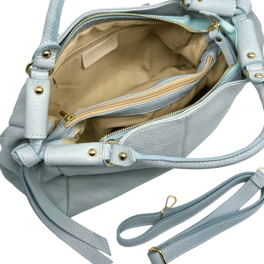 Doppia maniglia rigida tubolare in pelle. L’interno è ampio e spazioso, due ampi comparti interni, divisi da una tasca tramezza centrale con chiusura a zip e una tasca piatta interna.