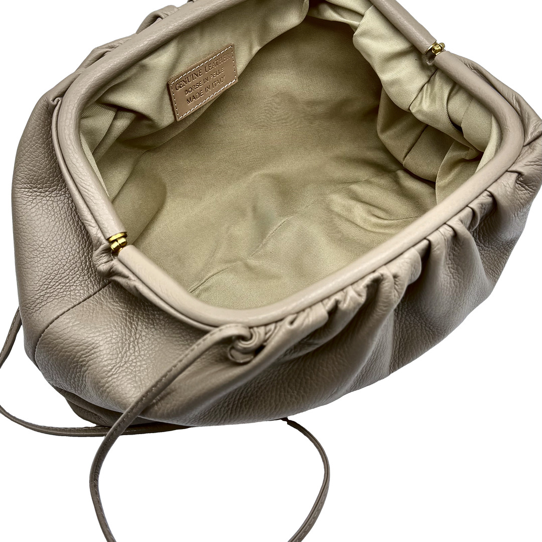 Elegante, morbida, scultorea. La borsa Nina, realizzata in morbida pelle, è il must-have di stagione. Maxi clutch, dalla forma destrutturata, è pensata per essere indossata in modi diversi: per look da sera, a spalla o crossbody grazie alla tracolla in pelle. Dalle occasioni speciali ai city look quotidiani, si adatta con naturalezza a ogni tuo momento. L’interno è organizzato in un unico scomparto per offrire lo spazio necessario per i propri effetti personali e rendere questa clutch capiente e pratica. Chiusura a scatto magnetica.
