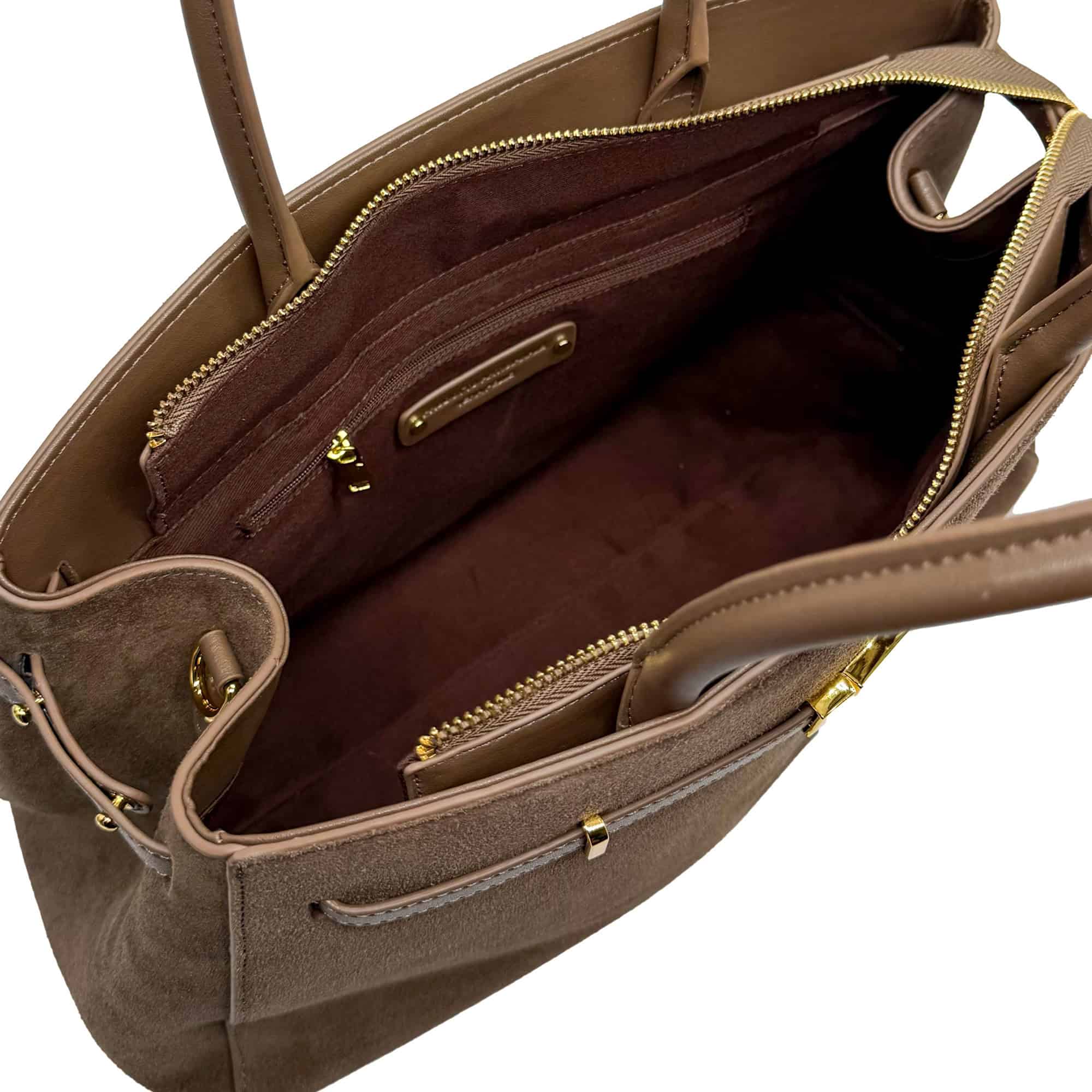 L’interno è organizzato in un ampio comparto, una tasca piatta interna e una con cerniera, per offrire lo spazio necessario per i propri effetti personali e rendere la borsa capiente e pratica. La fodera è realizzata in tessuto gabardine di cotone. Ampia chiusura con cerniera. Tracolla rimovibile e regolabile in pelle per indossarla comodamente anche cross-body. Made in Italy.