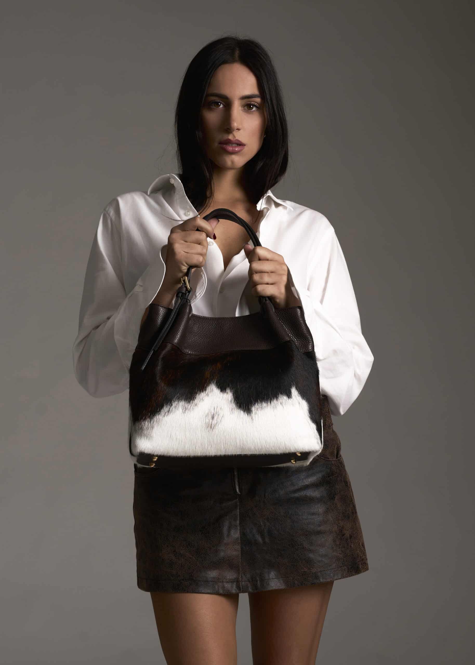 The Olimpia is a calfskin tote featuring double handles, a wide interior compartment, and organized pockets. Finished with a zip closure and an adjustable strap for crossbody wear.