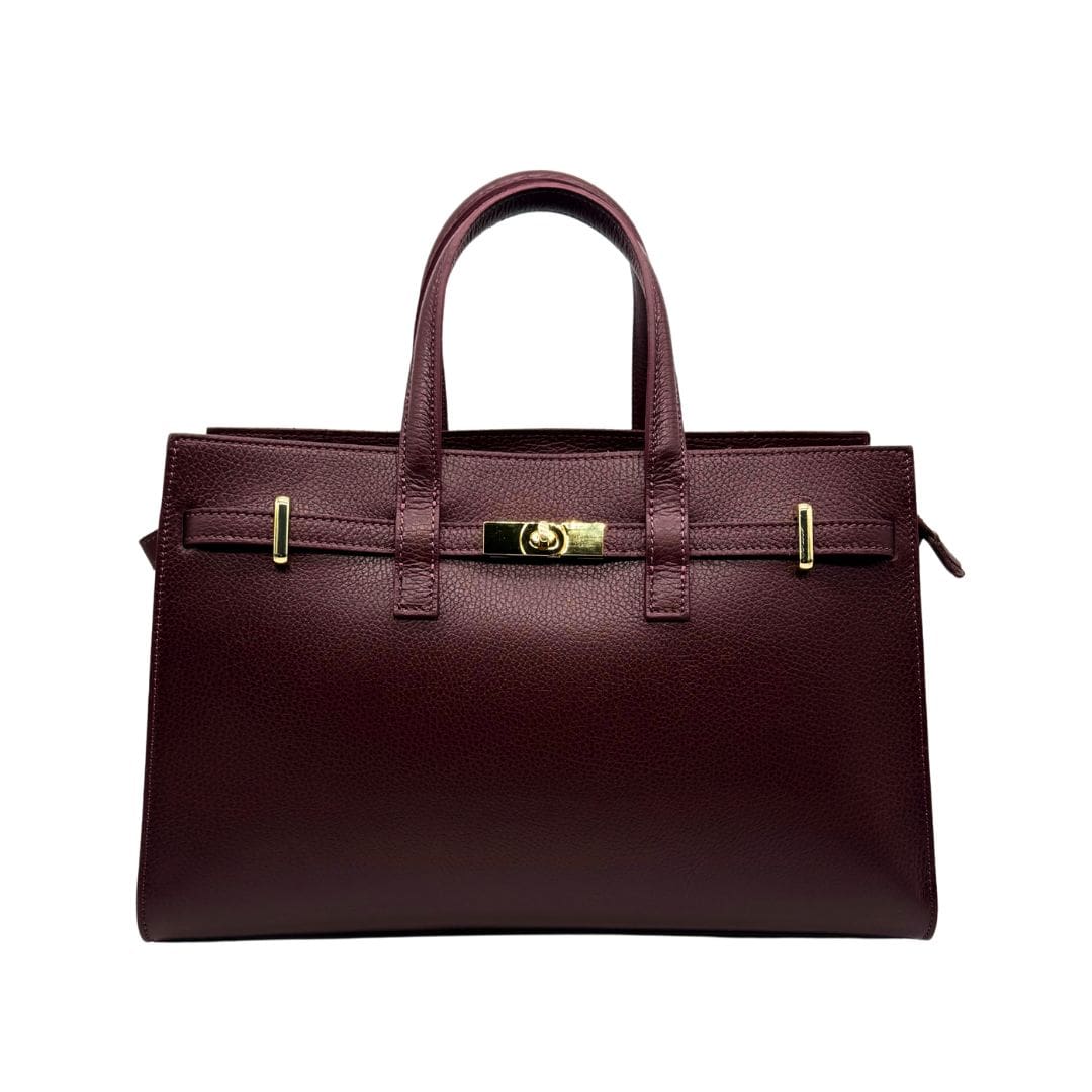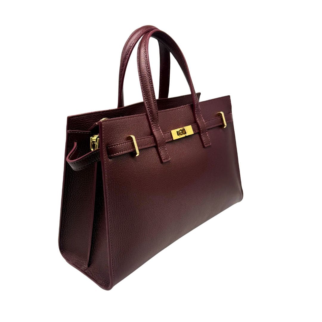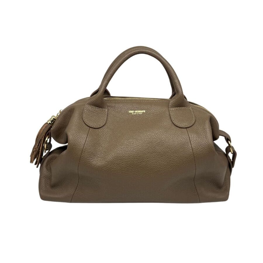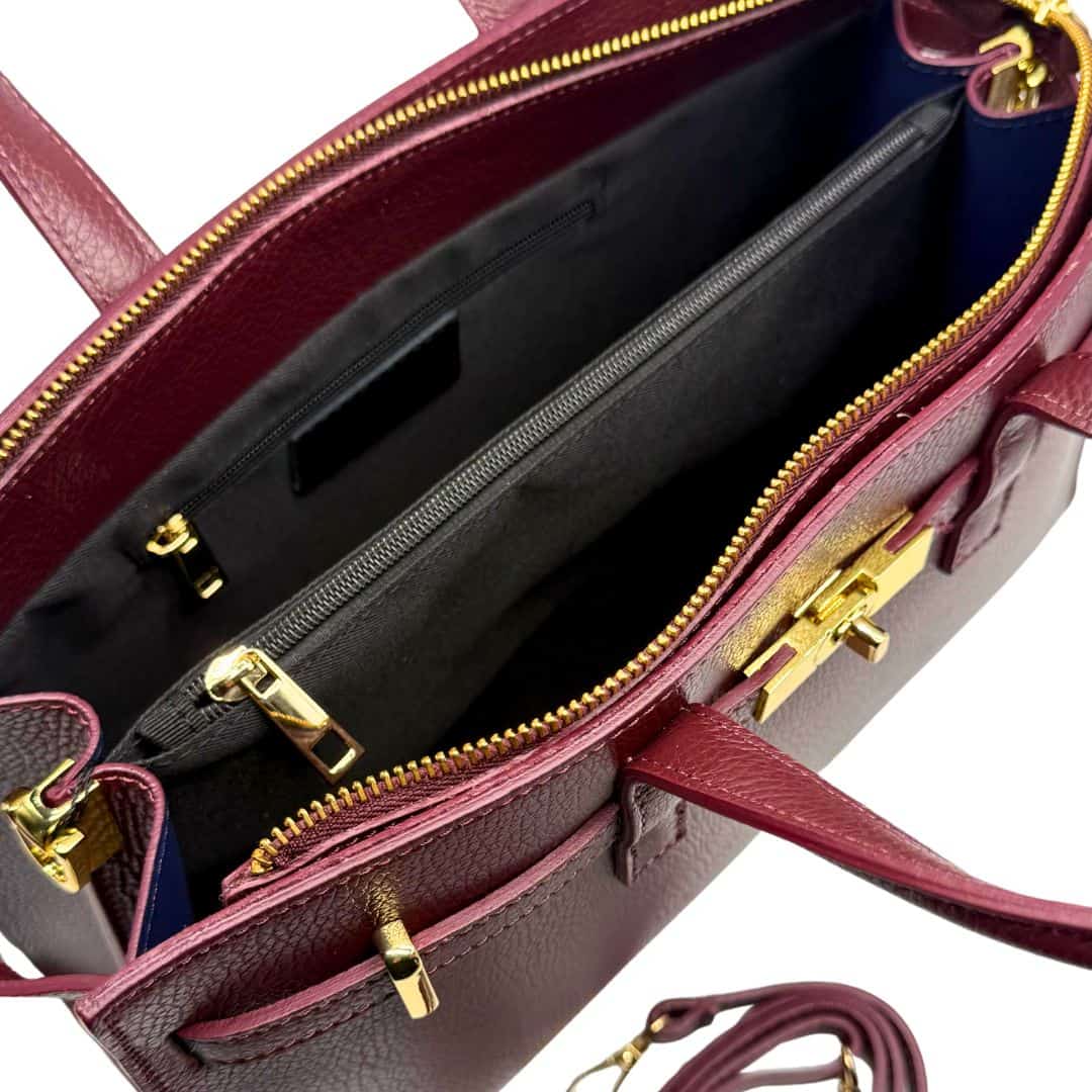 Doppia maniglia rigida tubolare in pelle, due ampi comparti interni, divisi da una tasca tramezza centrale con chiusura a zip e una tasca piatta interna. La fodera è realizzata in tessuto gabardine di cotone.