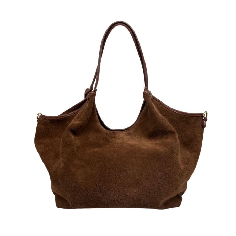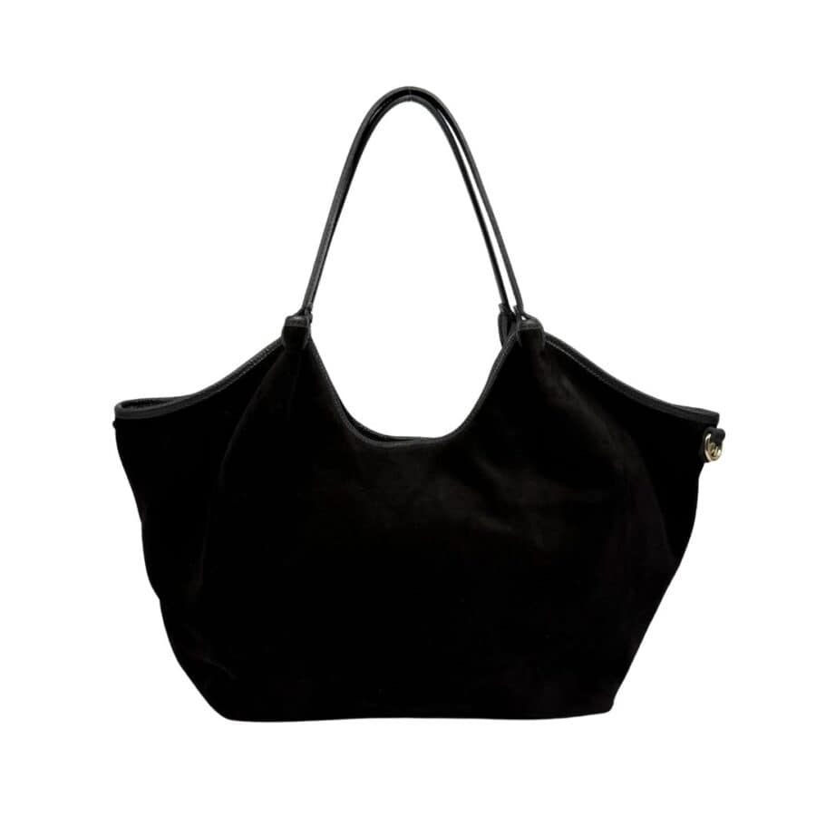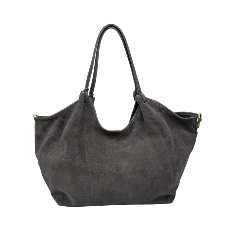 Pratica, capiente, dinamica. Silhouette easy chic per la borsa Shopping bag realizzata in morbida pelle scamosciata. Lavorazione artigianale e stile versatile, 100% Made in Italy.