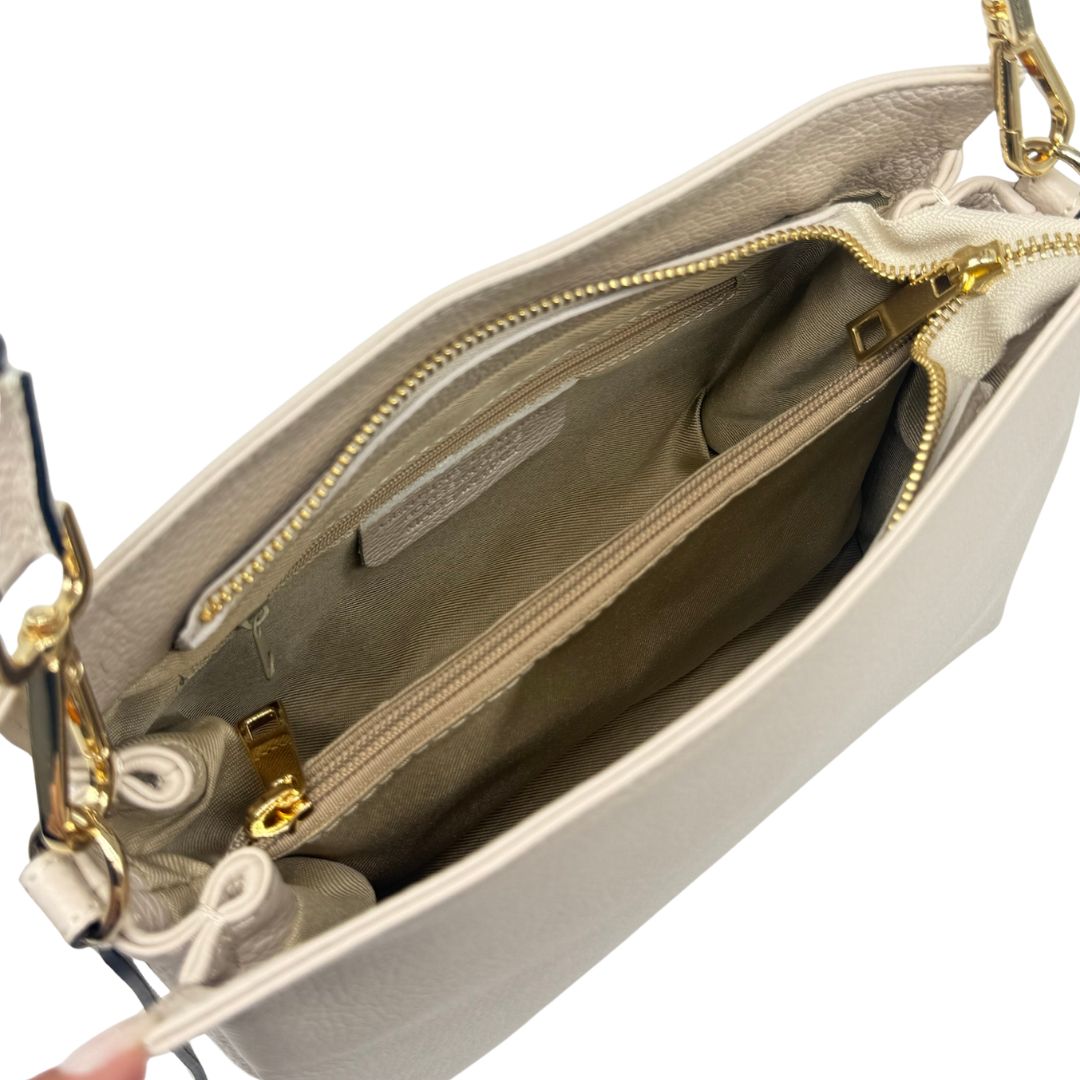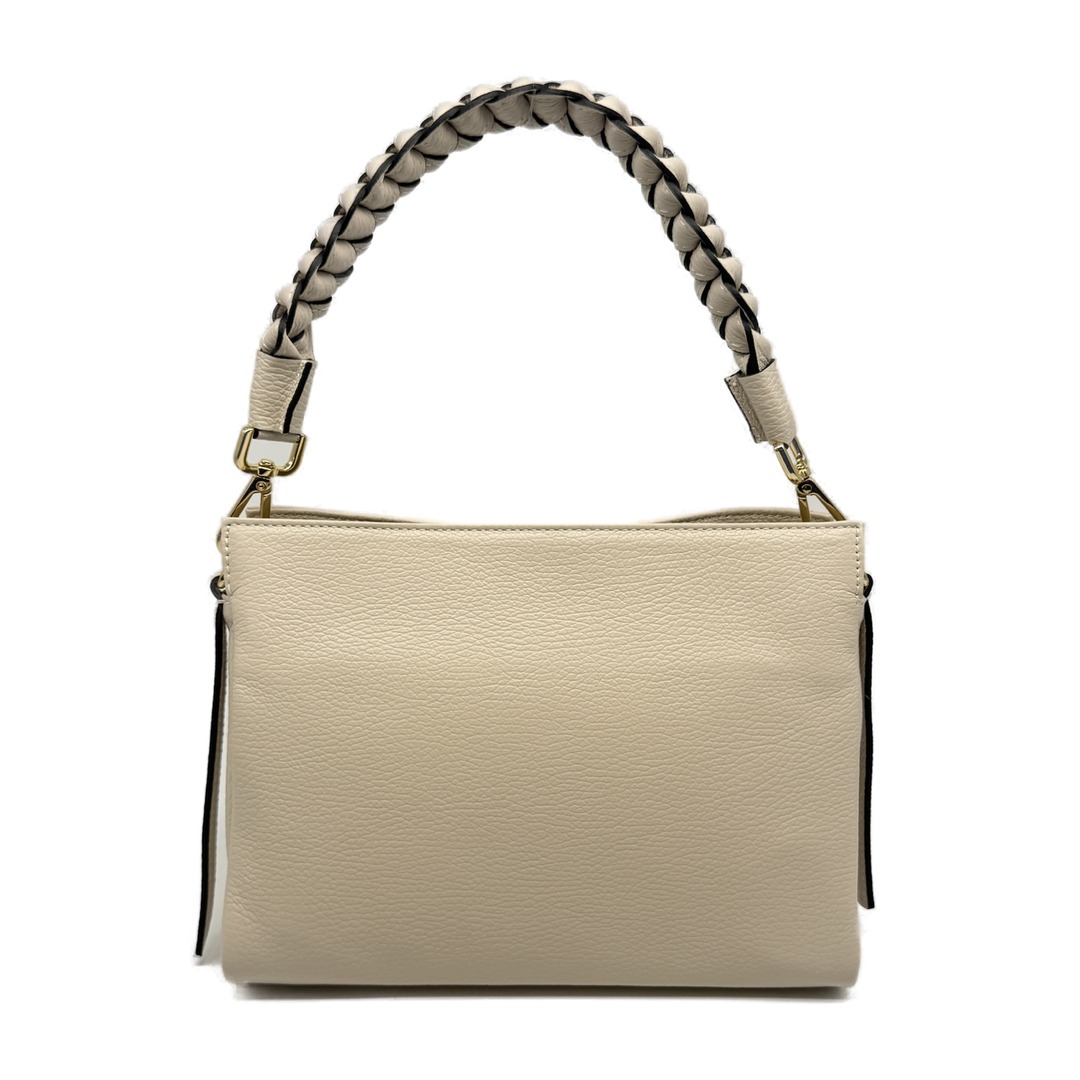 Capiente, compatta, funzionale. Silhouette easy chic e classica, dal design moderno e lineare, la borsa Yara, dalle dimensioni mini, è realizzata in morbida pelle di vitello e impreziosita da una particolare maniglia in pelle a forma di treccia. L’interno è ampio e spazioso, due ampi comparti interni, divisi da una tasca tramezza centrale con chiusura a zip e una tasca piatta interna. La fodera è realizzata in tessuto gabardine di cotone. Chiusura con cerniera. Tracolla rimovibile e regolabile in pelle per indossarla comodamente anche cross body. Lavorazione artigianale, Made in Italy.